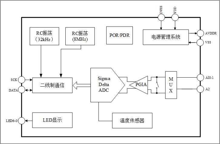 本芯片内置24位ADC、LED驱动、两线制通信等电路。