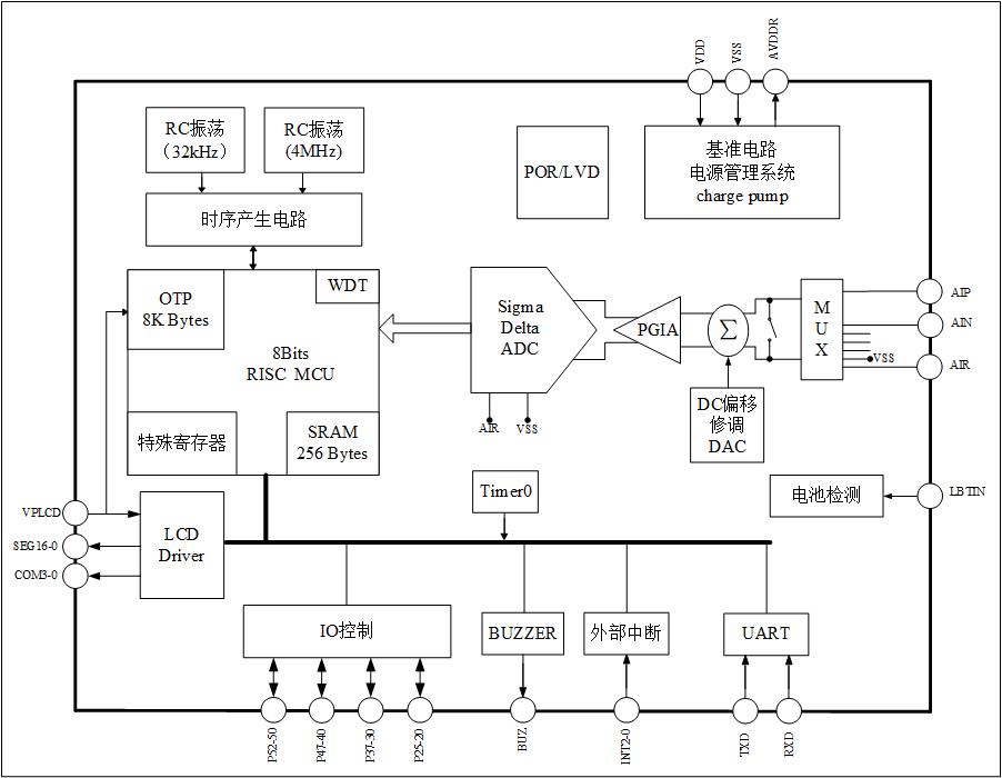 超低功耗设计,使用内部4MHz RC振荡器经内部电路处理而产生的2MHz时钟工作,3V工作电压下,整个芯片在典型应用时的工作电流只有1mA(不包括传感器功耗),非常适合电池供电的应用。