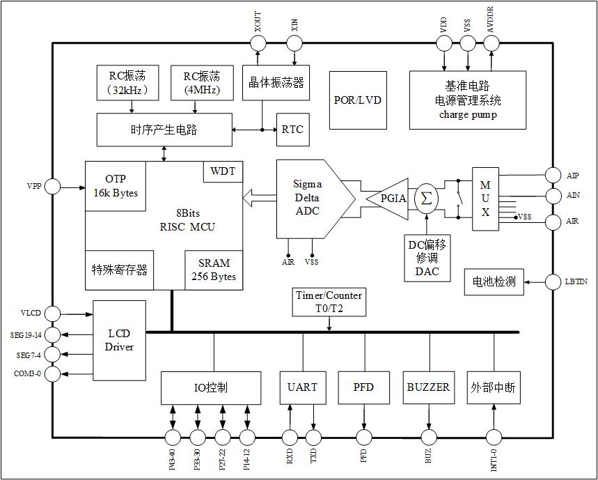 超低功耗设计,使用内部4MHz RC振荡器经内部电路处理而产生的2MHz时钟工作,3V工作电压下,典型应用时的工作电流只有1.1mA(不包括传感器功耗),非常适合电池供电的应用。